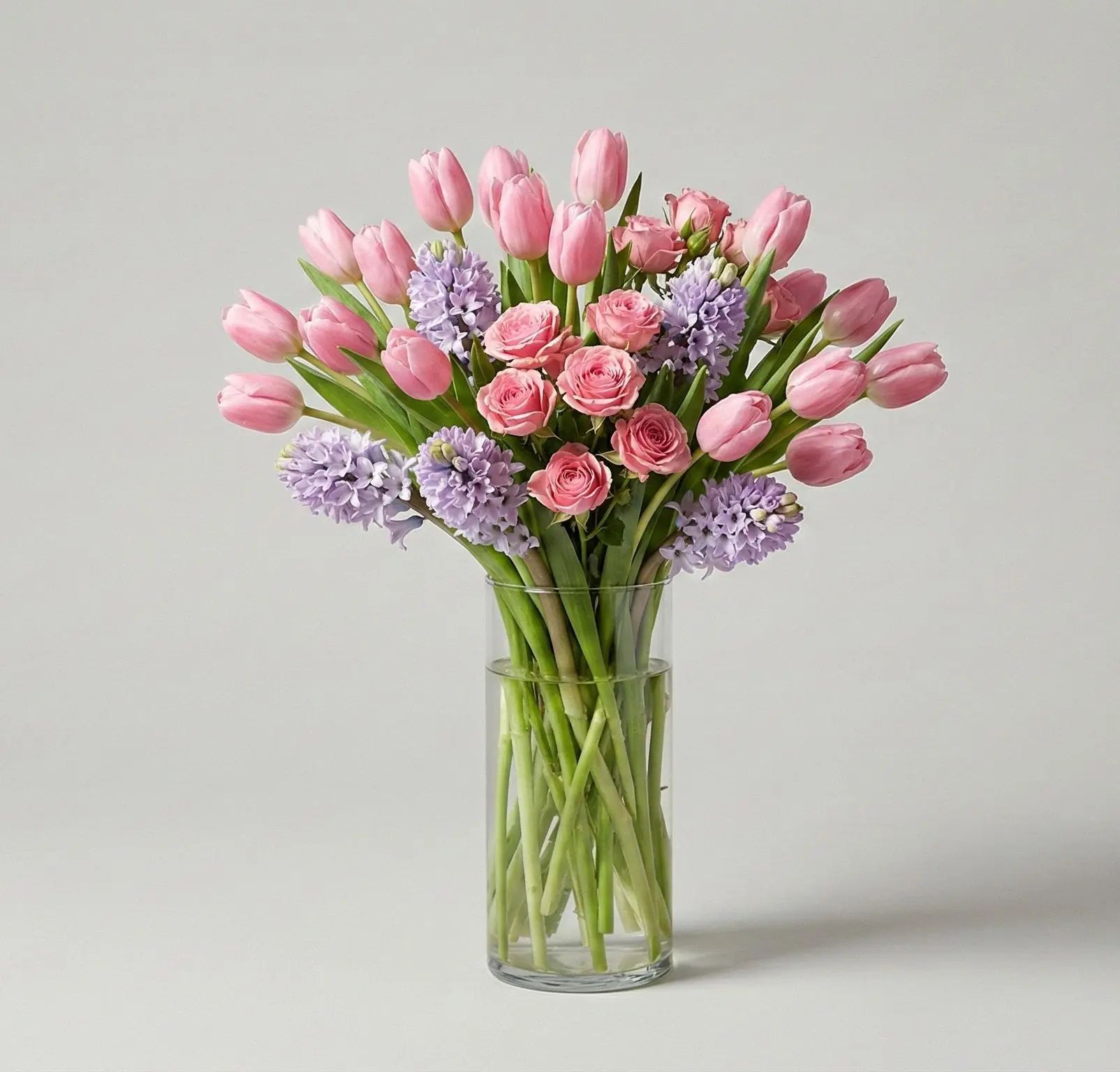 The Roselight Spring Symphony is a delicate bouquet featuring soft pink tulips, lush ranunculus, and fragrant hyacinths, arranged in a clear glass vase. This stunning display of springtime beauty brings warmth and freshness to any space, making it a perfect gift for any occasion, from birthdays to anniversaries, or simply to brighten up your home.