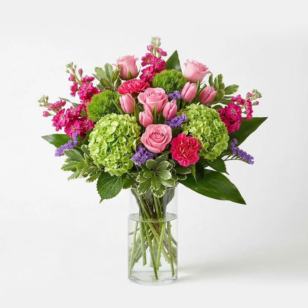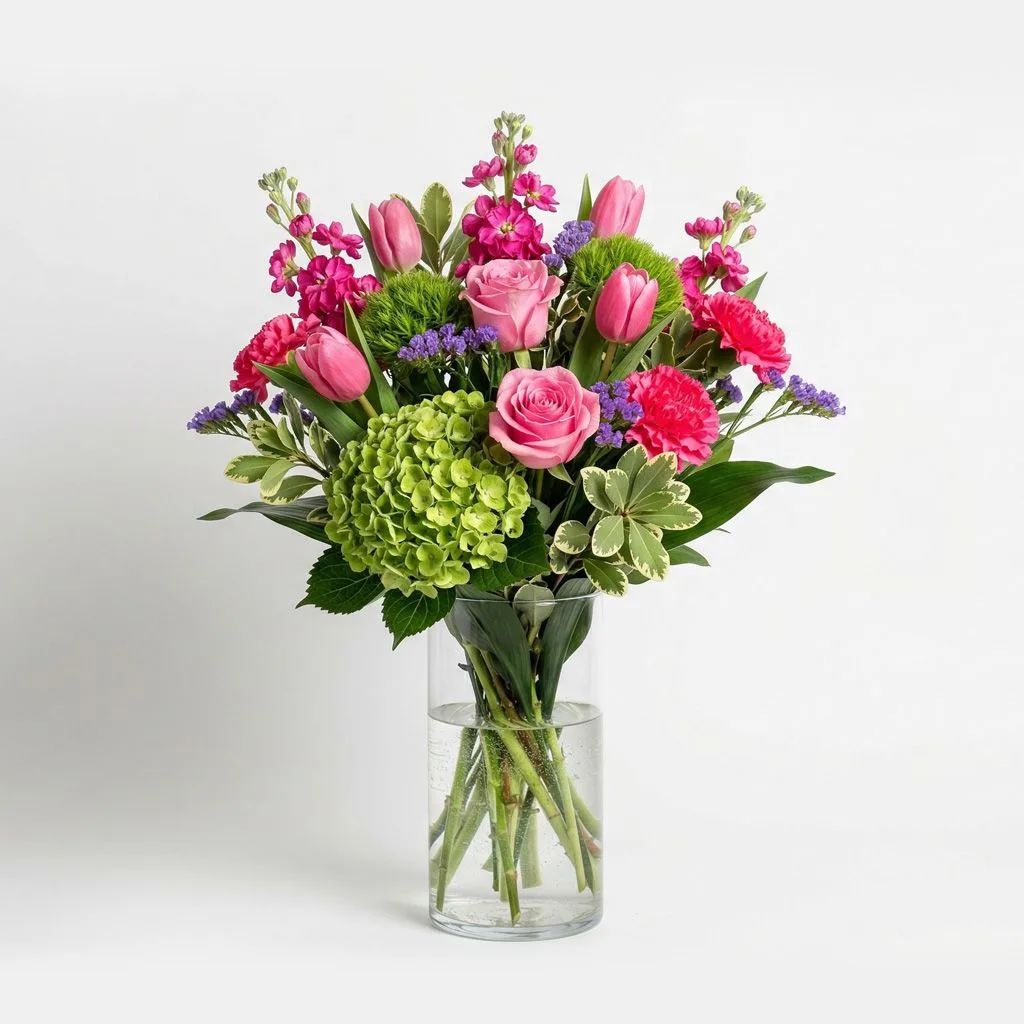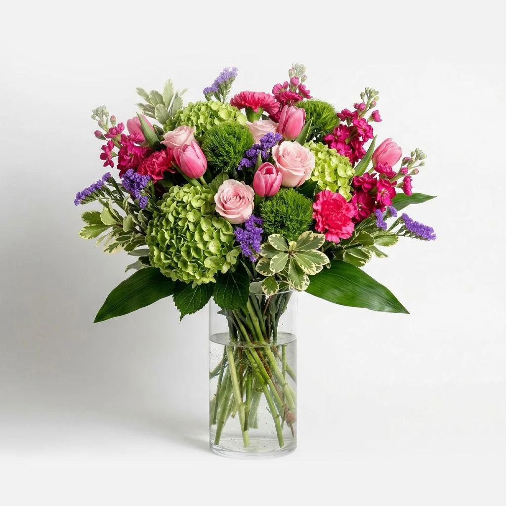 Spring Pink Tulip is a fresh, garden-inspired arrangement featuring soft pink tulips paired with lush green hydrangea, hot pink stock, roses, carnations, and textured dianthus. Accented with purple statice and layered greenery like variegated pittosporum and aspidistra leaves, this design blends vibrant color with refined elegance. The mix of rounded blooms, vertical texture, and natural foliage creates a balanced, airy bouquet suited for spring celebrations, birthdays, sympathy gestures, or everyday floral gifting. Designed with movement and softness, Spring Pink Tulip offers a polished yet natural look with strong seasonal appeal.