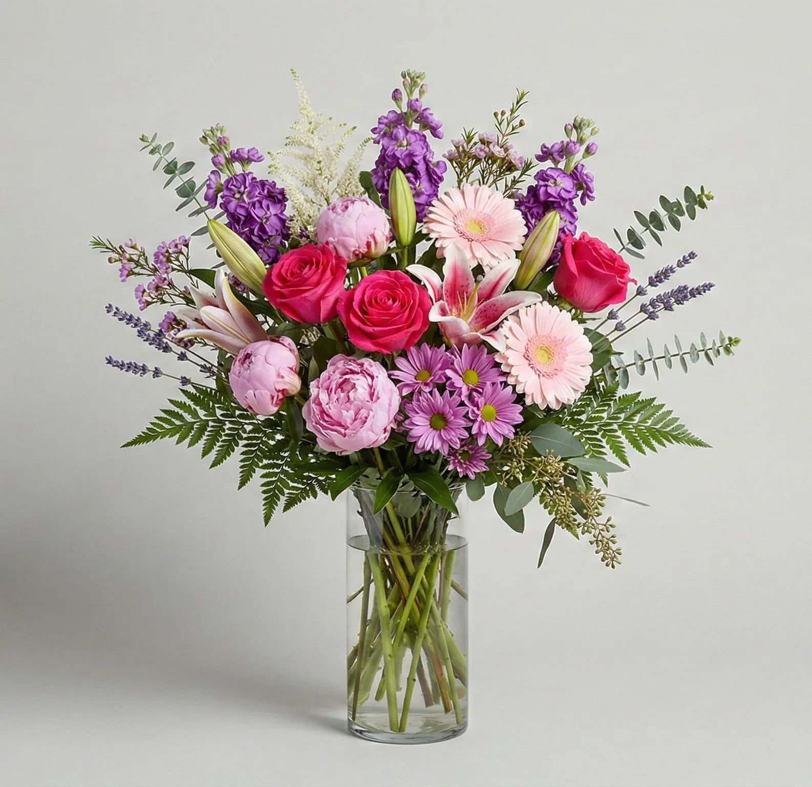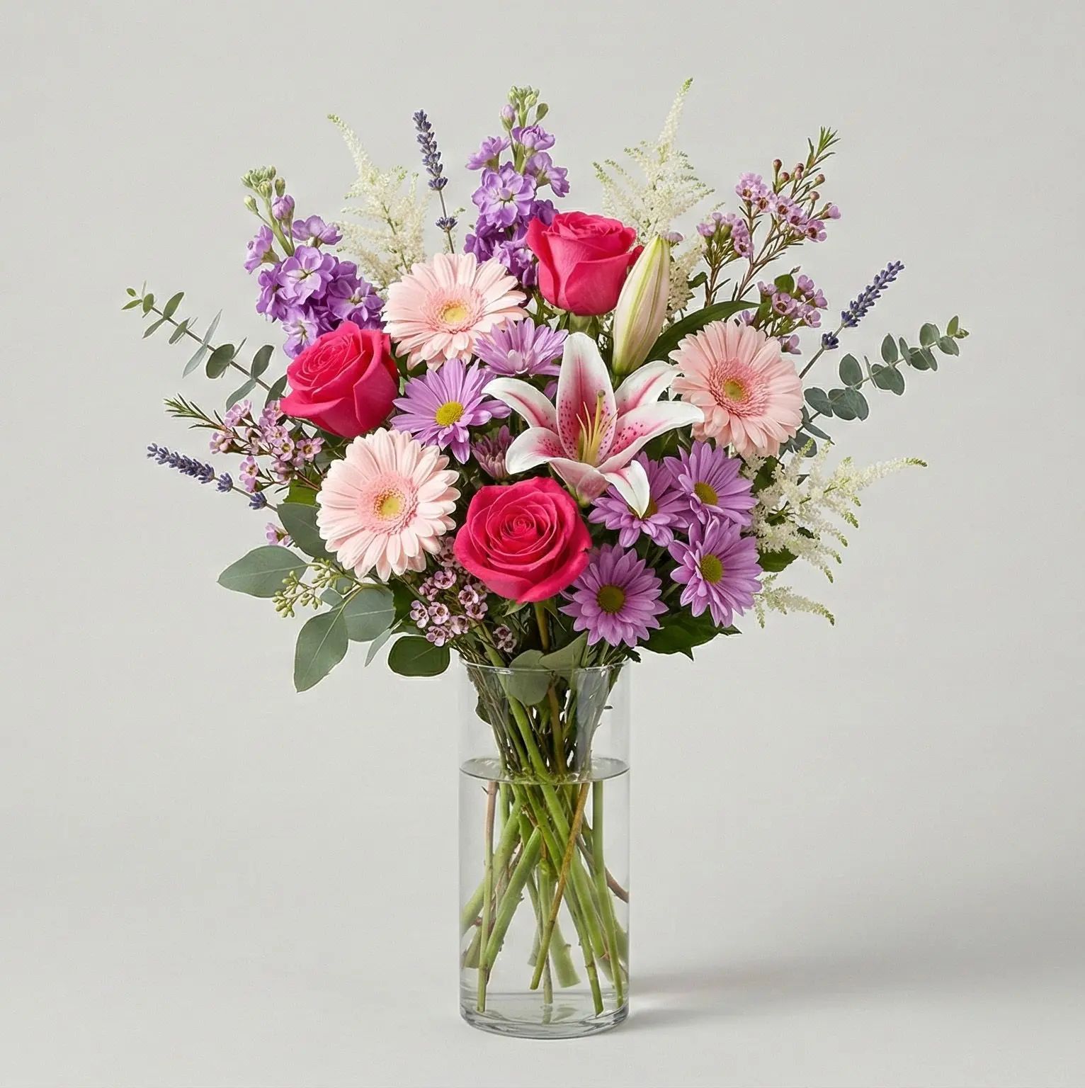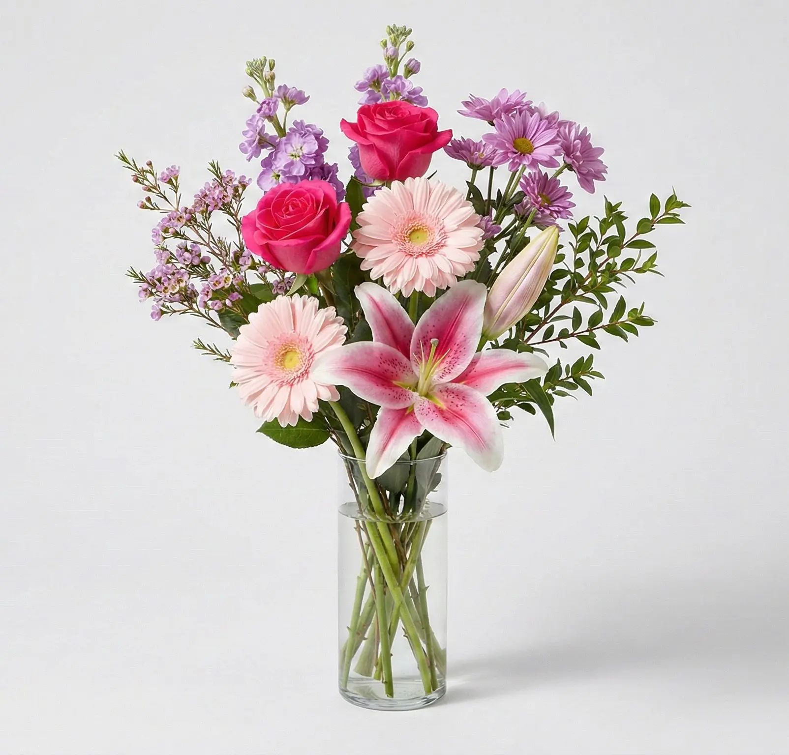 Celebrate life's beautiful moments with our stunning Berry Blooms! This vibrant bouquet bursts with hot pink roses, light pink gerbera daisies, and majestic stargazer lilies, creating an unforgettable display of joy. Perfect for brightening any space or sending a heartfelt message.