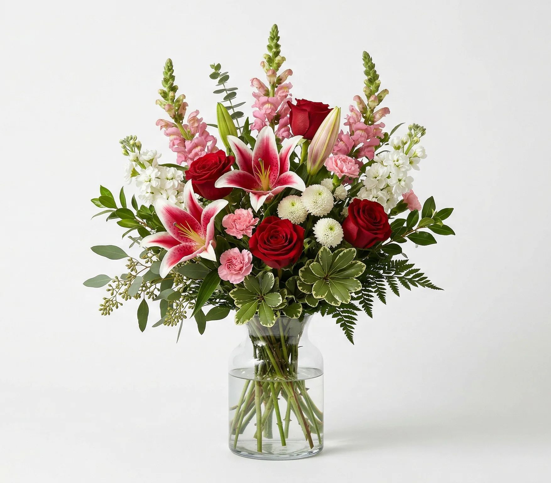 Crimson Stargazer is a refined floral arrangement designed to balance bold color with soft elegance. Rich red roses and fragrant Stargazer lilies form the focal point, creating depth and visual impact. Pink snapdragons introduce gentle height, while white stock, cushion poms, and mini carnations add texture and fullness. Accented with fresh greenery including seeded eucalyptus and variegated pittosporum, this arrangement offers a natural, layered look that feels both polished and inviting. Ideal for memorials, celebrations of life, or meaningful gestures, Crimson Stargazer presents a timeless expression of care and remembrance.