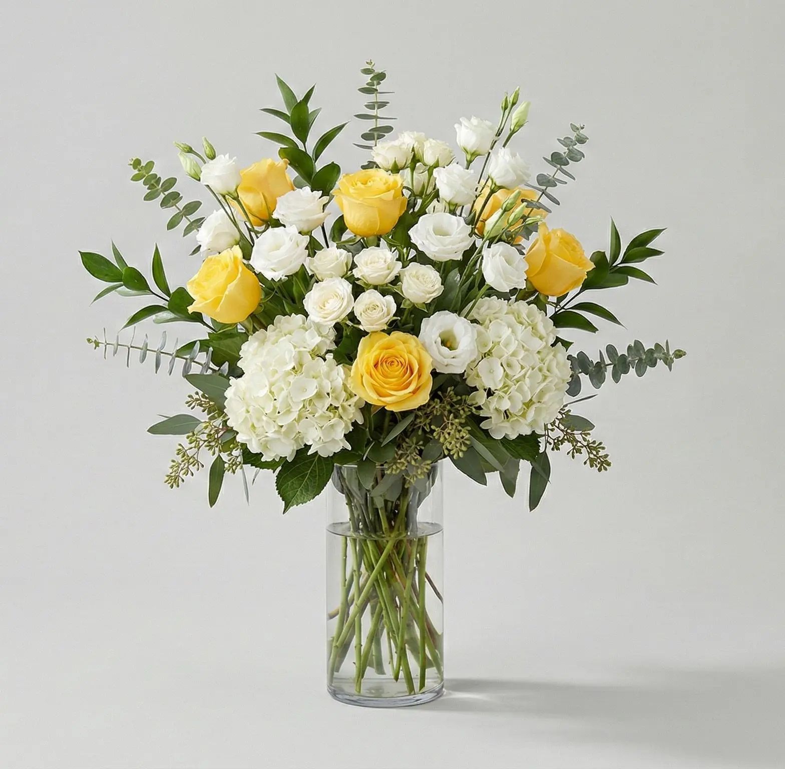 Brighten someone's day with the Golden Sunshine Bouquet. This elegant arrangement features radiant yellow roses, white lisianthus, delicate white spray roses, and hydrangeas, accented with light green hydrangeas and fresh greenery. Perfect for any occasion.