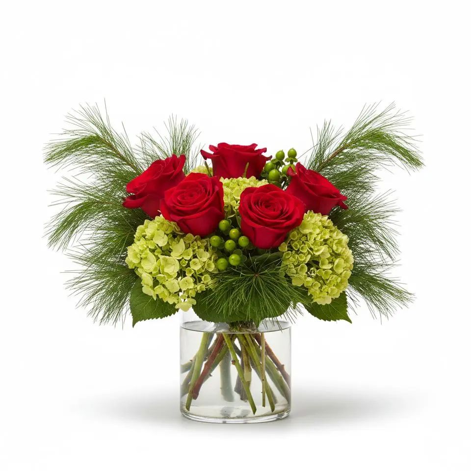 Experience the tranquil beauty of nature with our Woodland Serenity arrangement. Lush green hydrangeas, classic roses, and vibrant hypericum berries are elegantly combined with fresh pine, creating a harmonious display. This captivating bouquet brings a breath of fresh air and peaceful charm to any space.